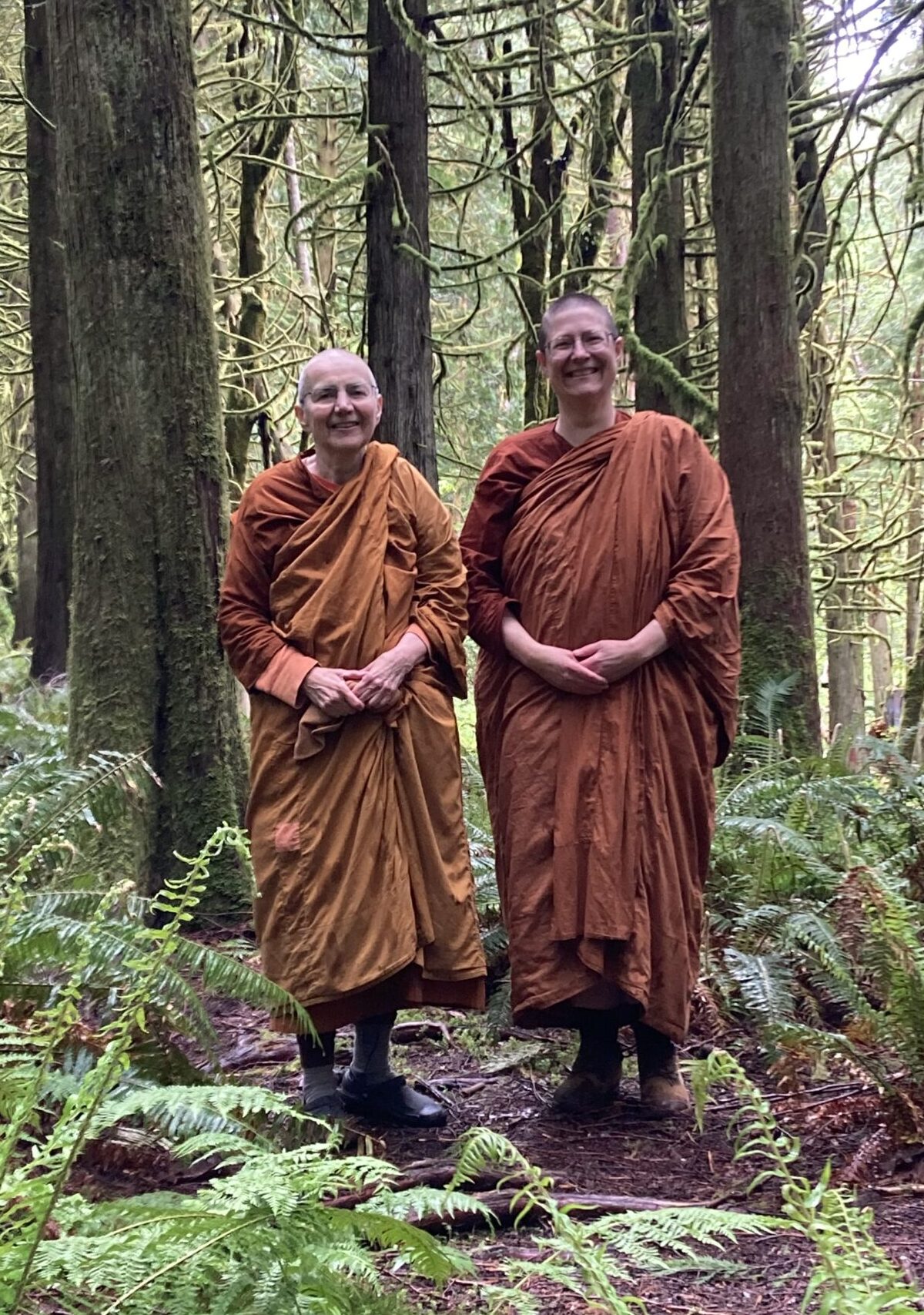 Ayya Suvijjānā and Ayya Niyyānika on a walk in a forest reserve near Passaddhi Vihara in Olympia, Washington. (Photo courtesy of Ayya Suvijjānā.)